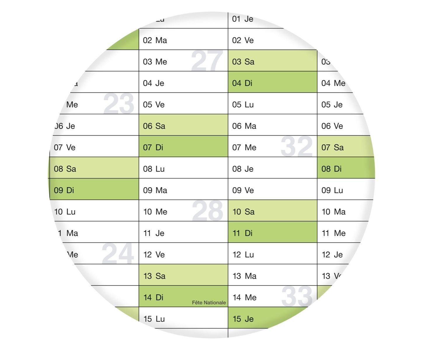 Toute l'année en un coup d'œil! Avec les week-ends et jours fériés à code couleur, une présentation claire des semaines civiles, du nombre de jours ouvrables et du changement d'heure