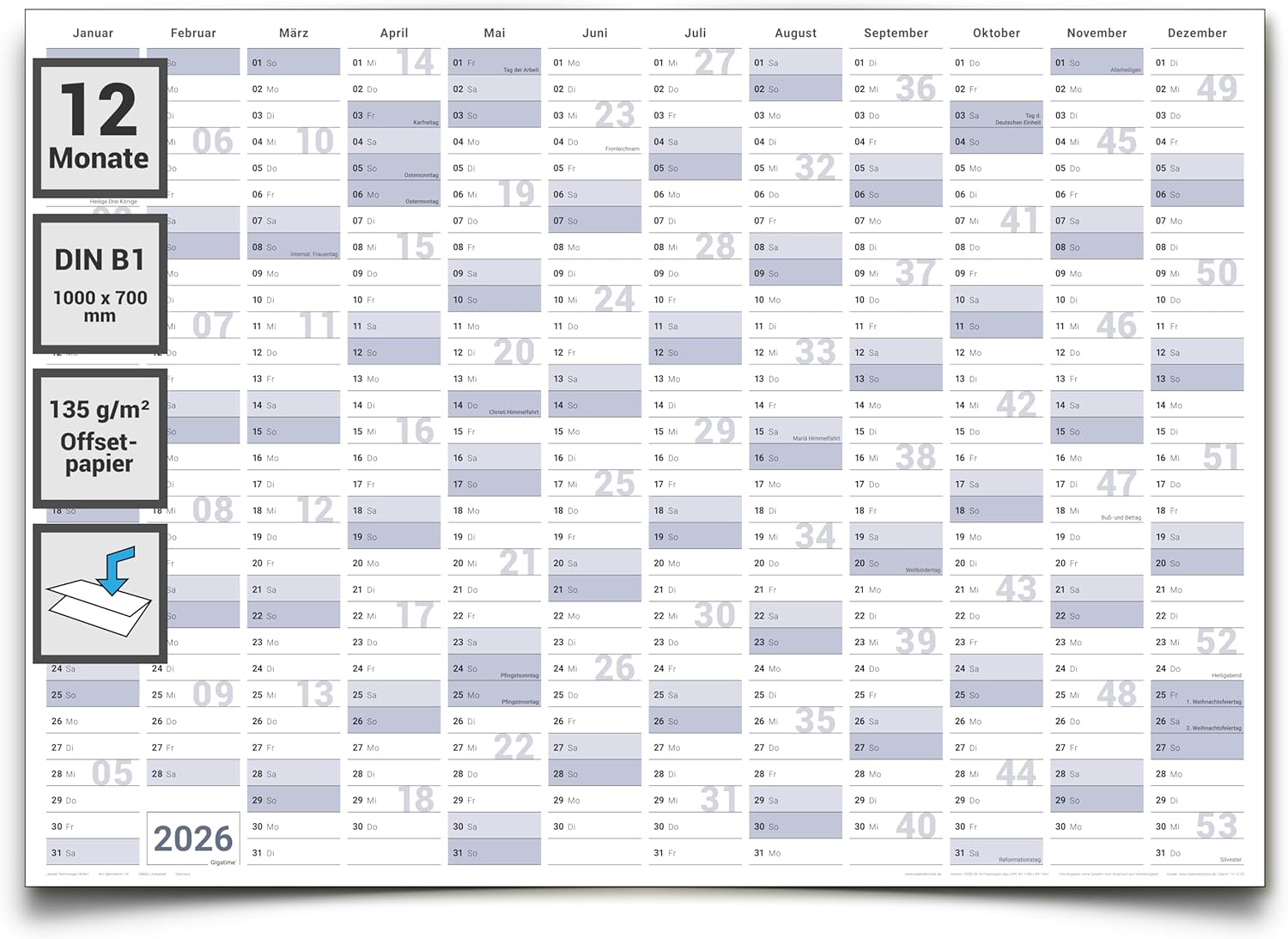 Gigatime Din B1 XL Jahresplaner Wandkalender 2026. Wandplaner gefaltet 100 x 70 cm gross, Jahreskalender Kalender in deutscher SpracheAngebotspreis 1,99 € UVP 2,99 €Inkl. 19% MwSt. , exkl. VersandkostenLieferzeit1 Tag